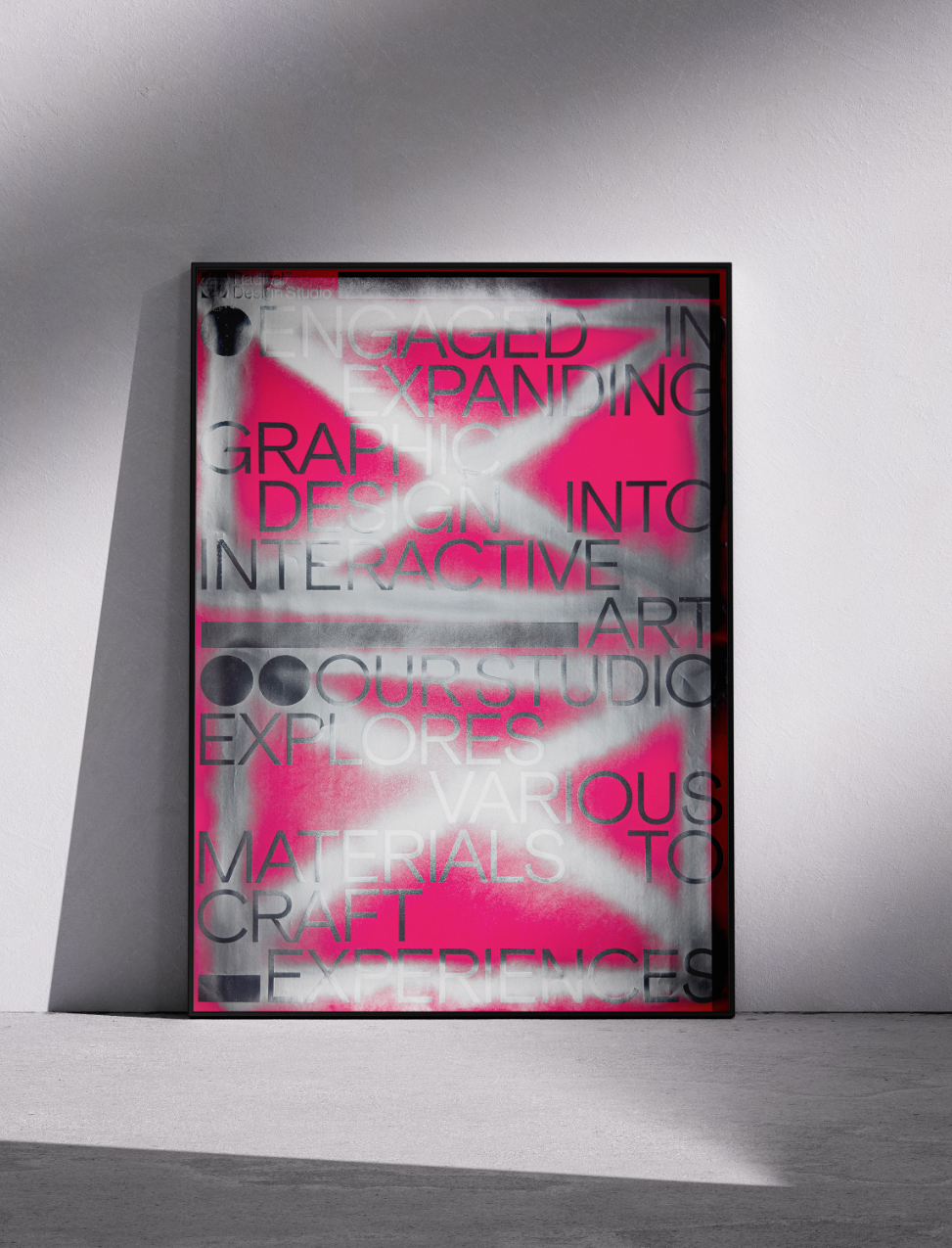 Our studio asserts an independent, experimental vision of graphic design, centered on interaction and exploration. Through the SERMENT series — a limited edition of nine B1 posters, each unique — we merge artistic practice with technical research. Built on a strict grid and driven by manifesto-like phrases, each piece is marked by a chromed spray stroke symbolizing our creative commitment. Conceived for public space, the project invites appropriation and collaboration, transforming visual communication into a collective field of experimentation, where design becomes an interactive, sensitive, and ever-evolving art form.
